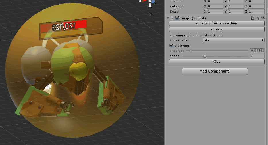Then, it took our template mob prefab and created prefab for the new mob – setting 3d model, animations, colliders, healthbars, rotations, effects etc. Also we had a nice editor where all this still can be customized – tweak colliders, change animations. Also it was important that we could split mob in parts – if it could be destroyed part by part, or if parts could act separately – like hand or claw that has its own animation behaviour.
